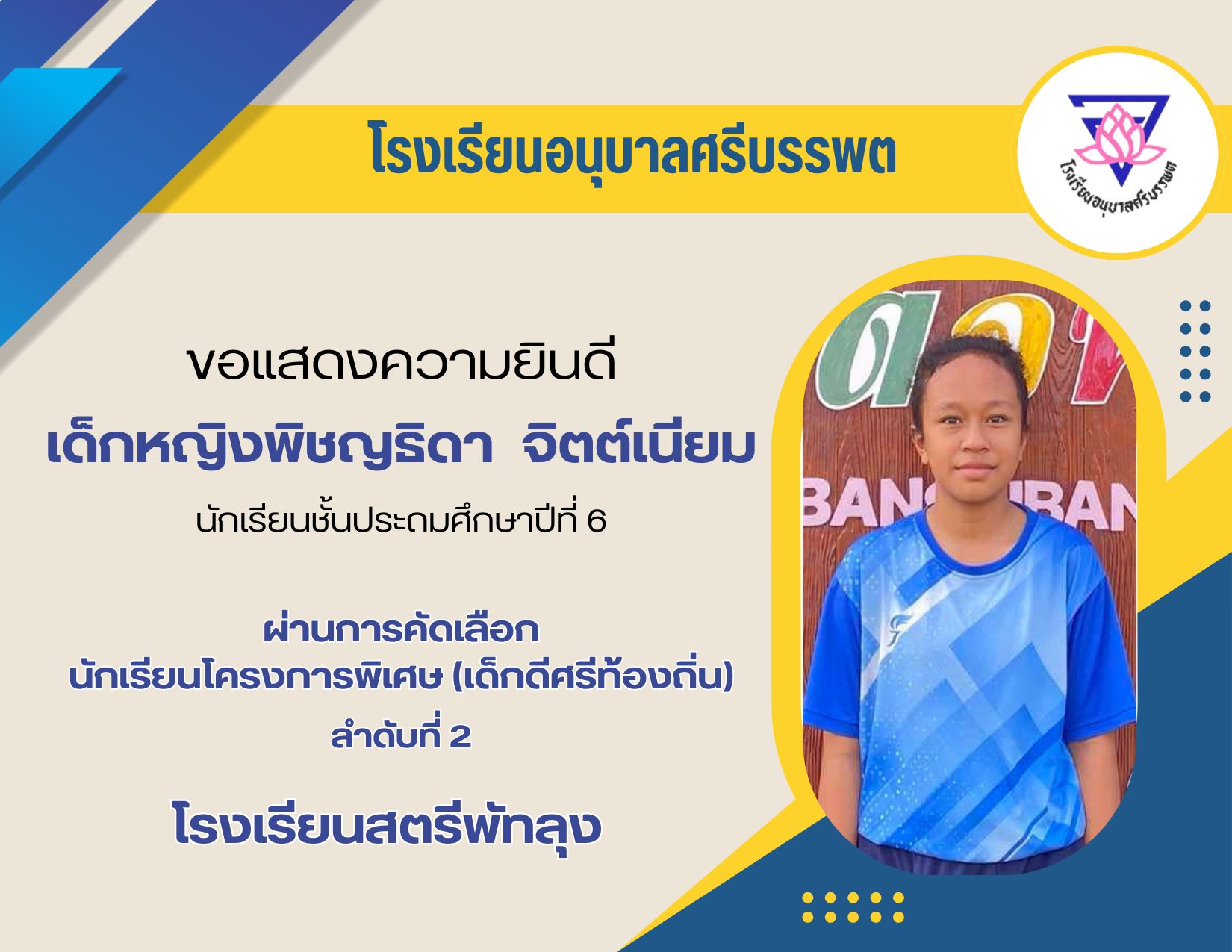 ขอแสดงความยินดี เด็กหญิงพิชญธิดา  จิตต์เนียม นักเรียนผ่านการคัดเลือกนักเรียนโครงการพิเศษ (เด็กดีศรีท้องถิ่น) โรงเรียนสตรีพัทลุง ลำดับที่ 2