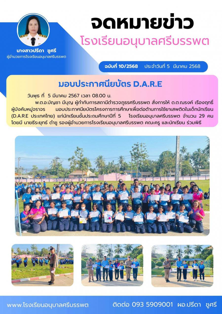 มอบประกาศนียบัตรโครงการการศึกษาเพื่อต่อต้านการใช้ยาเสพติดในเด็กนักเรียน (D.A.R.E ประเทศไทย)